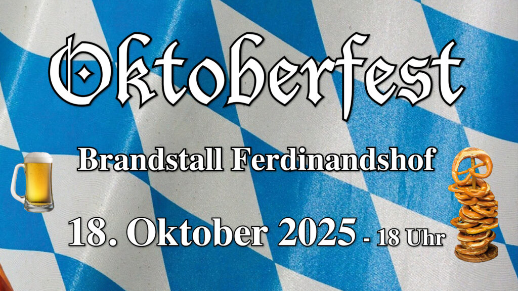 Am 18. Oktober heißt es im Brandstall Ferdinandshof wieder: Lederhosen an, Dirndl raus – es wird zünftig! Ab 18 Uhr beginnt der Einlass, ab 19 Uhr sorgt die Brassband Uecker-Brass gemeinsam mit dem Original Wies’n Anton für stimmungsvolle Blasmusik, gute Laune und echte Oktoberfest-Atmosphäre. Natürlich ist auch für das leibliche Wohl bestens gesorgt – von deftigen Schmankerln bis zur frisch gezapften Maß.