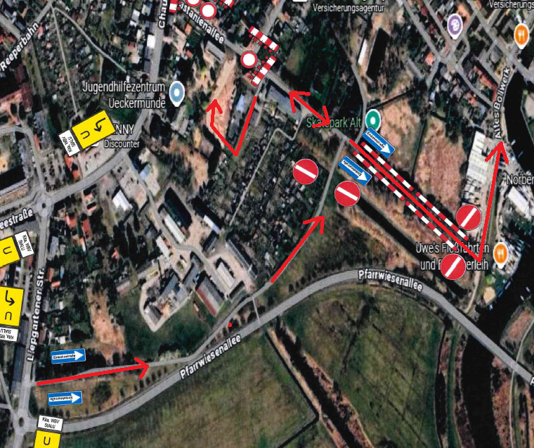 Deshalb führt eine weitere ausgeschilderte Einbahnstraße die Fahrzeuge aus der Kastanienallee in Richtung Bootsverleih zur Ueckerklappbrücke. Aus Gründen des Schutzes der alten Kastanienallee ist auch hier Begegnungsverkehr nicht möglich und deshalb eine Einbahnstraße eingerichtet worden. Wir bitten alle Verkehrsteilnehmer, sofern nicht unbedingt notwendig, den Bereich Kastanienallee nicht zu befahren. Fußgänger und Radfahrer kommen zumindest bis zur Weihnachtszeit noch durch den Kreuzungsbereich Goethestraße/Kastanienallee.