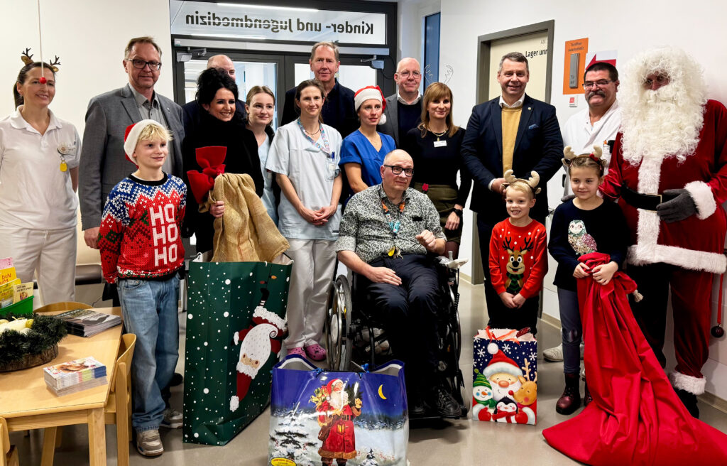 Neben den hochrangigen Gästen aus Politik und Verwaltung folgten auch der Ärztliche Leiter und Chefarzt der Klinik für Chirurgie, Dipl.-Med. Frank Büchner, der Krankenhausdirektor Stefan Fiedler sowie die Pflegedienstleitung Karolin Timm der Einladung des Teams der Abteilung für Kinder- und Jugendmedizin unter Chefarzt Dr. med. Christian Niesytto zum gemeinsamen Nachmittag. Bevor der Weihnachtsmann an jedem Zimmer klopfte und Schokoladenweihnachtsmänner verteilte, stimmten die Anwesenden „Stille Nacht, heilige Nacht“ an, das über den geschmückten Flur der Pädiatrie hallte.