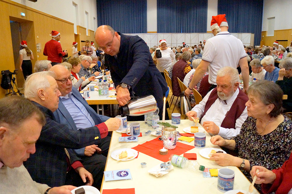 Nach einer gemütlichen Kaffeerunde mit Kuchen und Dominosteinen erfreuten sich die Teilnehmenden an Weihnachtsliedern, die vom Chor der Stadt Torgelow und vom Shantychor „Seegrund“ Ahlbeck intoniert wurden. An den reich gedeckten Tafeln servierten Landfrauen, Schülerinnen und Schüler den Gästen die Getränke. Unter die Helfenden mischte sich auch Philipp Staak, Propst der Propstei Pasewalk im Pommerschen Evangelischen Kirchenkreis, und schenkte frischen Kaffee aus. Zudem eröffnete der Propst das weihnachtliche Konzert mit einem geistlichen Impuls.