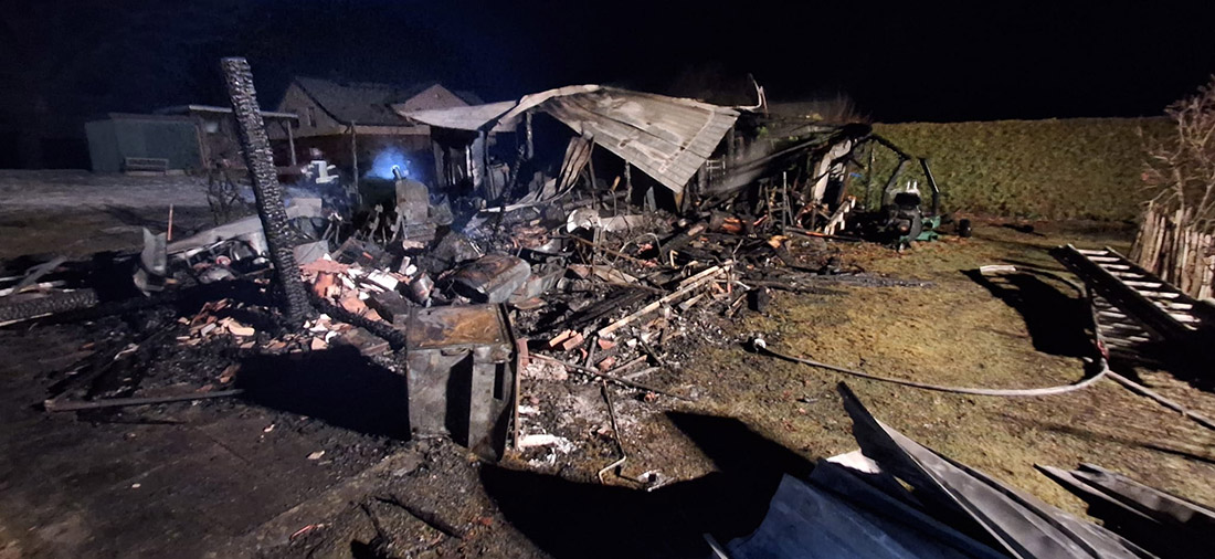 Am 09.02.2026 gegen 20:15 Uhr meldet ein Zeuge über den Notruf der Rettungsleitstelle, dass in der Eggesiner Straße in Vogelsang-Warsin ein Schuppen brennt. Umgehend wurden Einsatzkräfte von Freiwilliger Feuerwehr und Polizei zum Einsatz gebracht. Bei deren Eintreffen bestätigte sich der Sachverhalt. Der Schuppen brannte bereits in voller Ausdehnung.