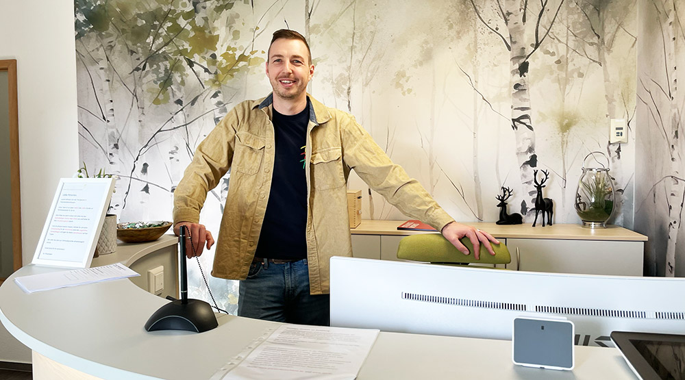 Und das sieht man bereits beim Betreten der Räume. Romano Döring hat kräftig angepackt und der Praxis ein frisches, modernes Gesicht gegeben. Helle Wände, neue Möbel und ein einladender Eingangsbereich mit gemütlicher Couch schaffen eine Atmosphäre zum Ankommen und Wohlfühlen. Fünf moderne Behandlungsräume sind entstanden. Wer genau hinschaut, erkennt auch hier seine Handschrift: Der Wald an der Wand erinnert an die Gestaltung der Praxis in Eggesin.